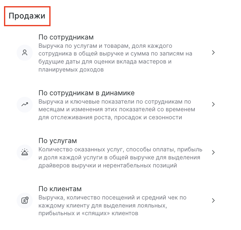 Используйте эти отчеты, чтобы понимать источники выручки и эффективность по сотрудникам, услугам и клиентам.