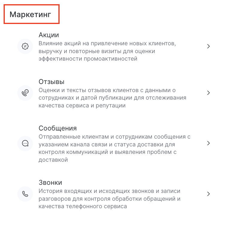 - Акции — просматривайте, как промо-акции привлекают клиентов и влияют на повторные визиты и выручку. Подробнее — в этой статье.