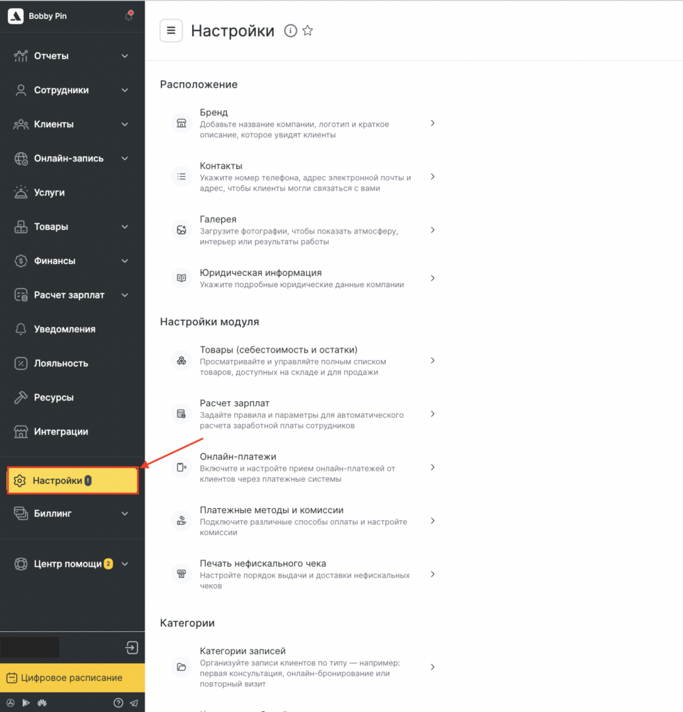 Раздел Настройки был переработан и теперь разделeн на группы — чтобы вы могли быстрее находить нужные параметры: от данных локации и бренда до настроек модулей (платежи, товары, зарплаты) и системных параметров.