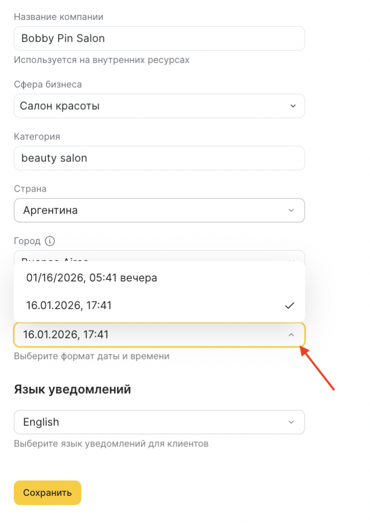 Название вашей компании, которое используется во внутренних интерфейсах Altegio (например, в админ-панели и внутренних списках). - Тип бизнеса