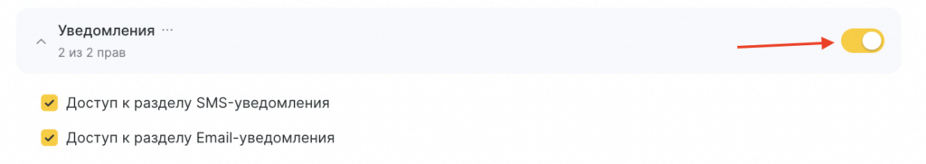 В блоке «Уведомления» можно включать и отключать права для выбранной роли.