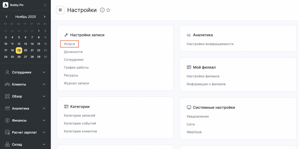 - Перейдите в раздел Настройки > Настройки записи > Услуги.