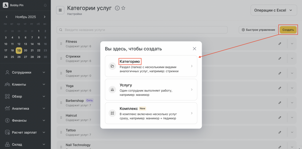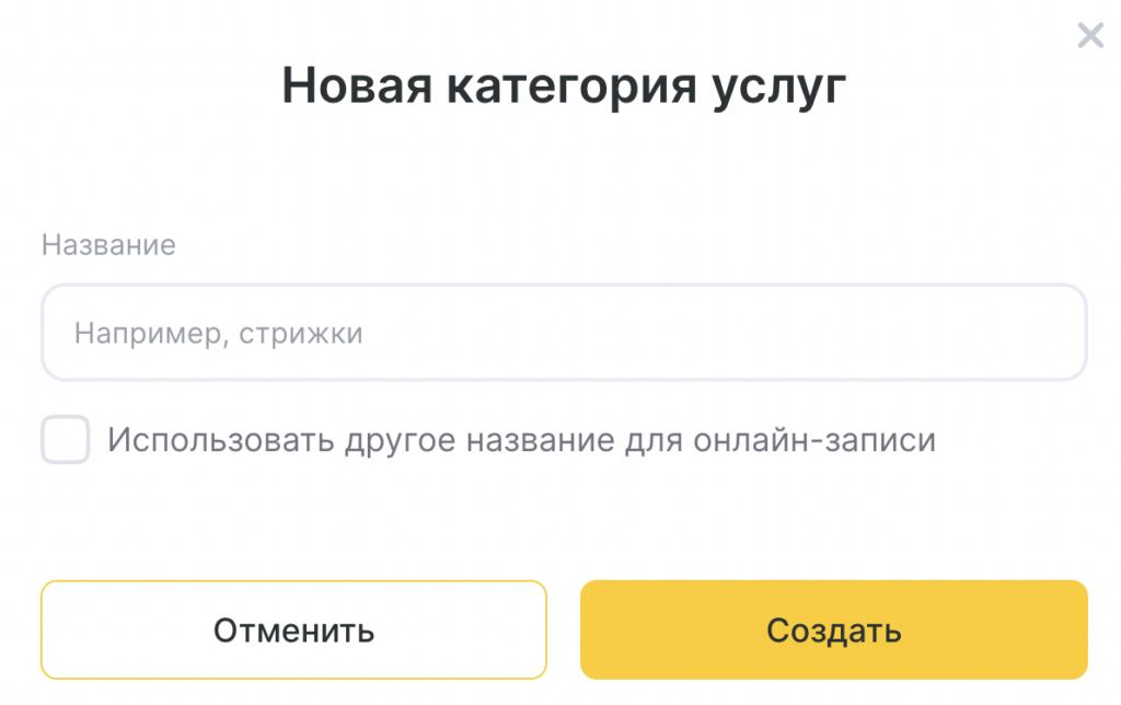 Откроется новое окно, в котором нужно внести название категории услуг, например, массажные услуги или мужские стрижки, и нажать кнопку Создать.