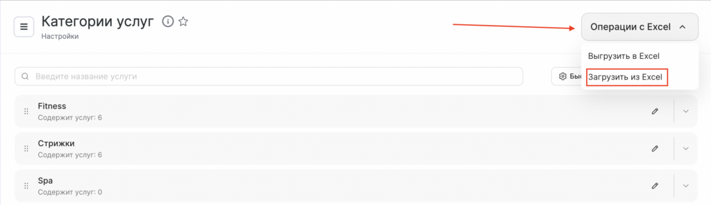- Чтобы загрузить услуги из Excel-файла, нажмите в правом верхнем углу Операции с Excel > Загрузить из Excel и следуйте инструкциям на экране или в этой статье.