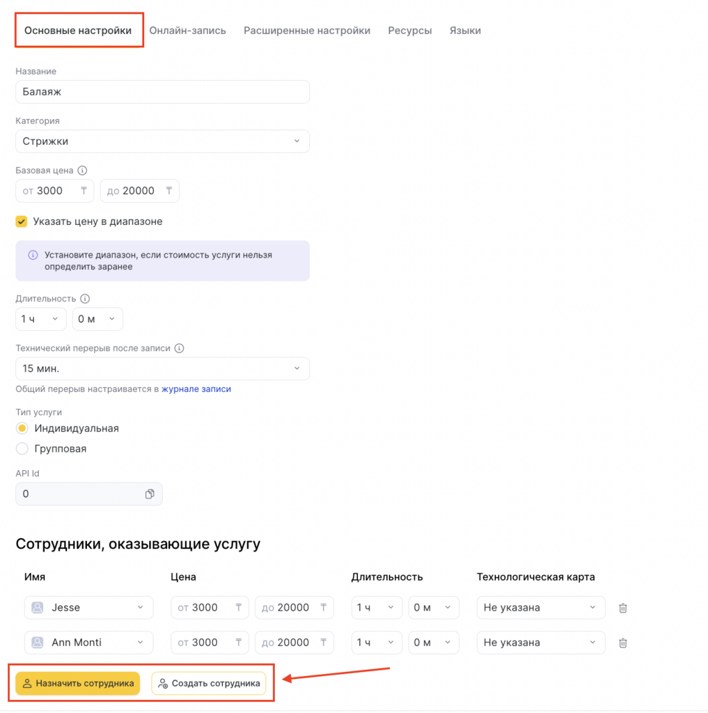 - Для того чтобы добавить сотрудника к услуге, перейдите во вкладку Основные настройки в настройках услуги.
