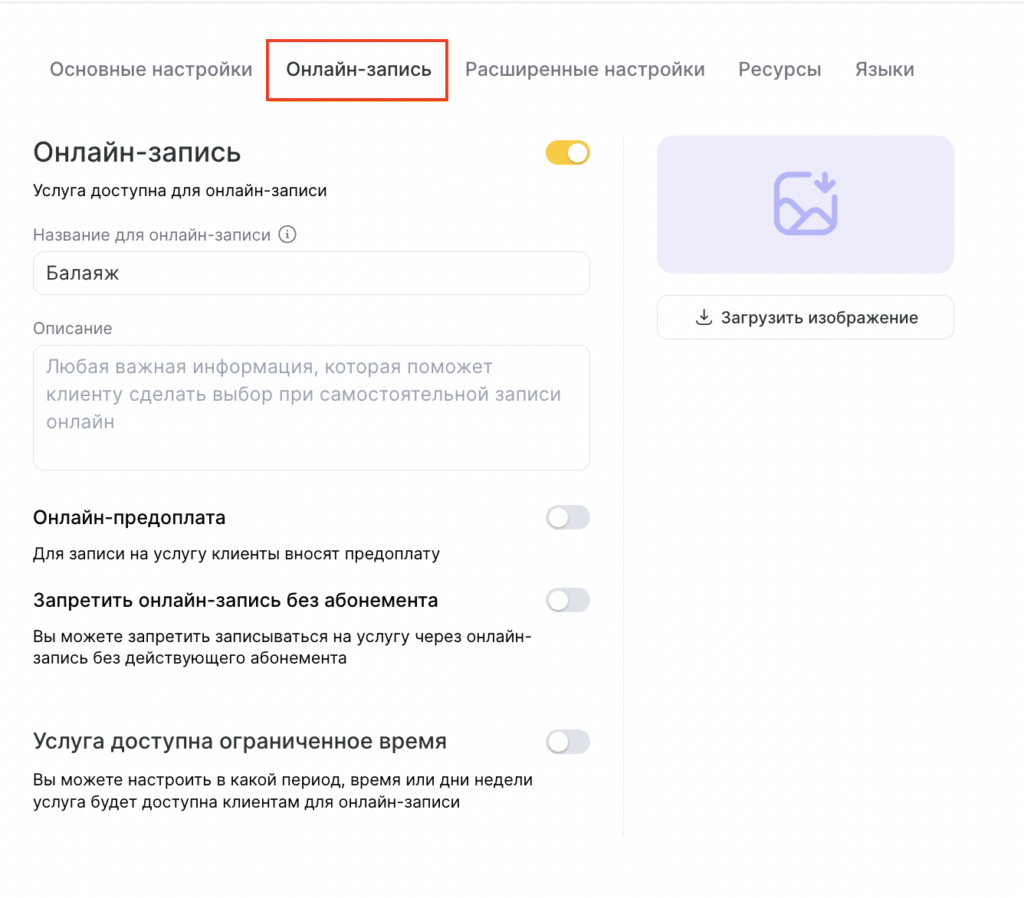 - Укажите, будет ли услуга отображаться в Онлайн-записи.