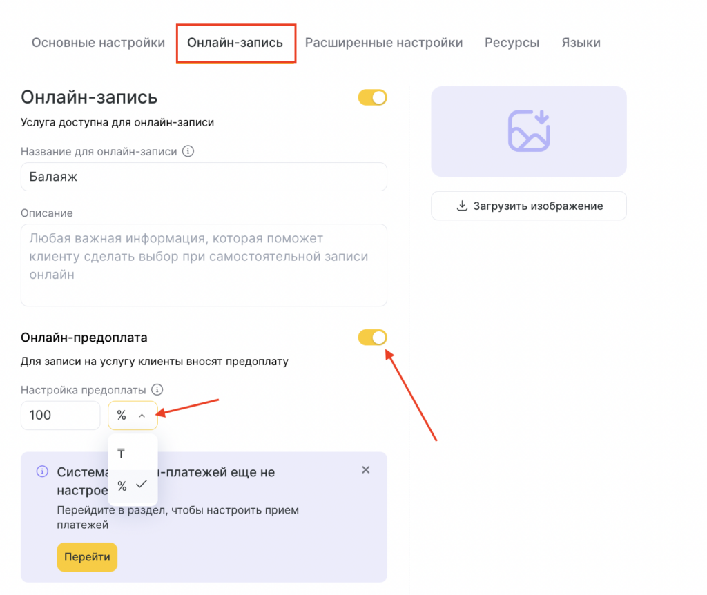 - Для онлайн-предоплаты необходимо переключить соответствующий ползунок в поле Онлайн-предоплата. При включенной онлайн-предоплате, клиенты смогут оплатить услугу в виджете онлай-записи.