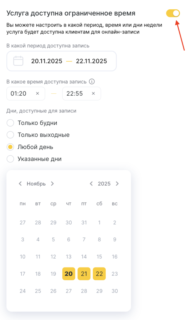 Укажите «В какой период доступна запись», «В какое время доступна запись», и «Дни, доступные для записи» («Только будни», «Только выходные», «Любой день», «Указанные дни» — для указанных дней нужно отметить необходимые дни в календаре).