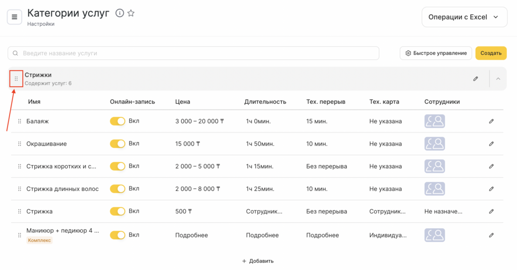 Услуги можно перемещать по списку внутри категории, для этого нажмите на кнопку с точками слева от названия услуги и перетяните строку на нужное место. Эта последовательность услуг отображается виджете онлайн-записи и при создании записи в журнале.