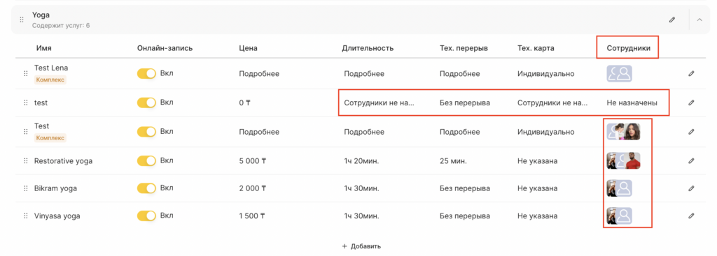 Назначить услуги сотрудникам можно двумя способами: