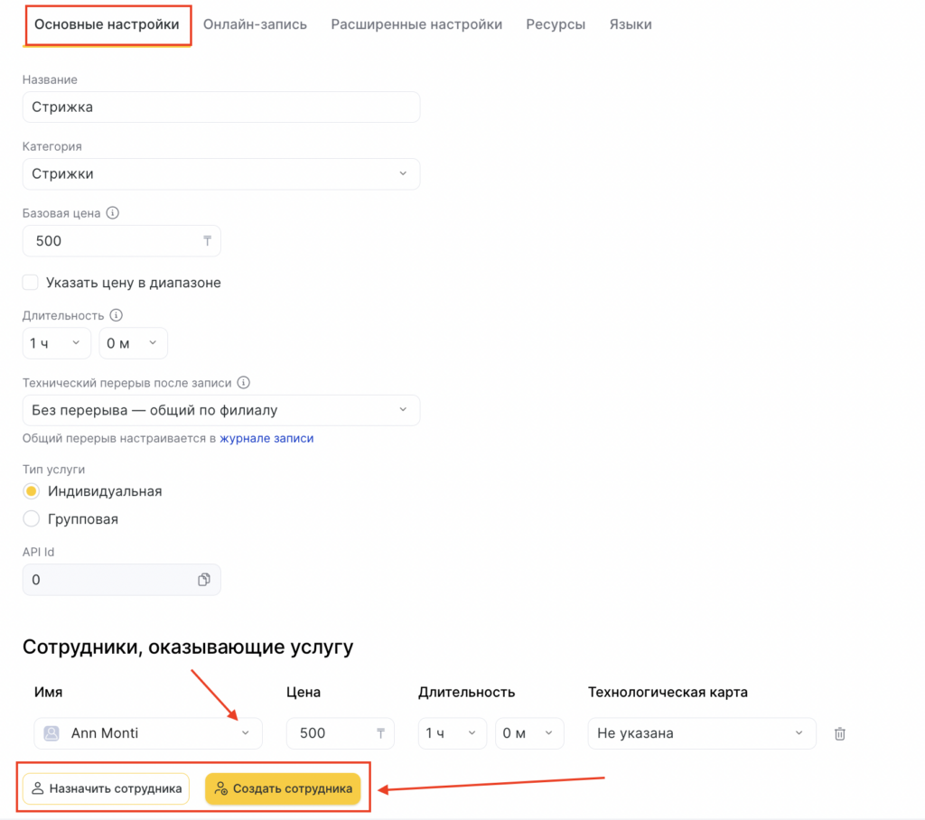 - В новом окне сразу откроется вкладка Основные настройки, чтобы назначить сотрудника на услугу, нажмите кнопку Назначить сотрудника. (Вы также можете создать нового сотрудника, не выходя из раздела, нажав на кнопку Создать сотрудника.)
