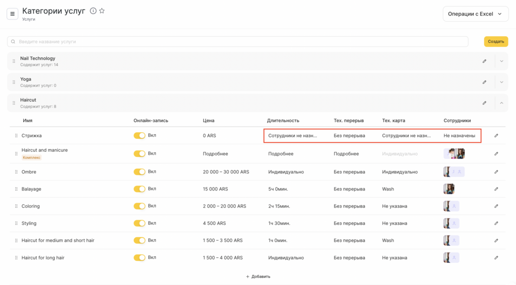 - Откройте нужную категорию, выберите услугу и нажмите на фото сотрудника или на кнопку Не назначены под шапкой Сотрудники, также можно нажать на другие кнопки Сотрудники не назначены.