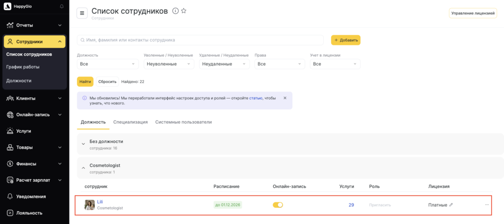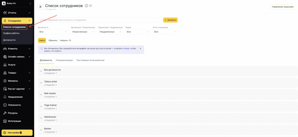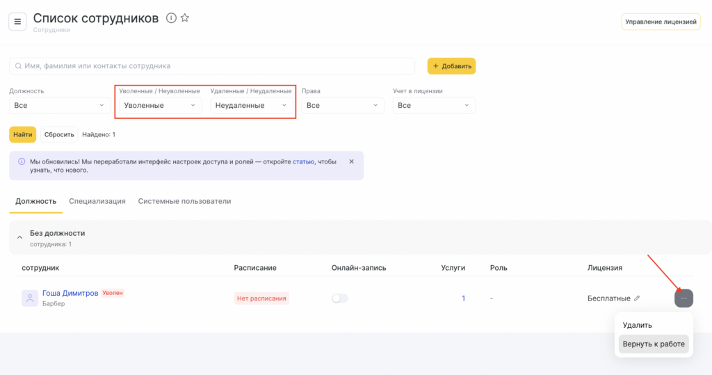 - Теперь можно перейти в раздел Сотрудники > Список сотрудников и уволить или удалить сотрудника.