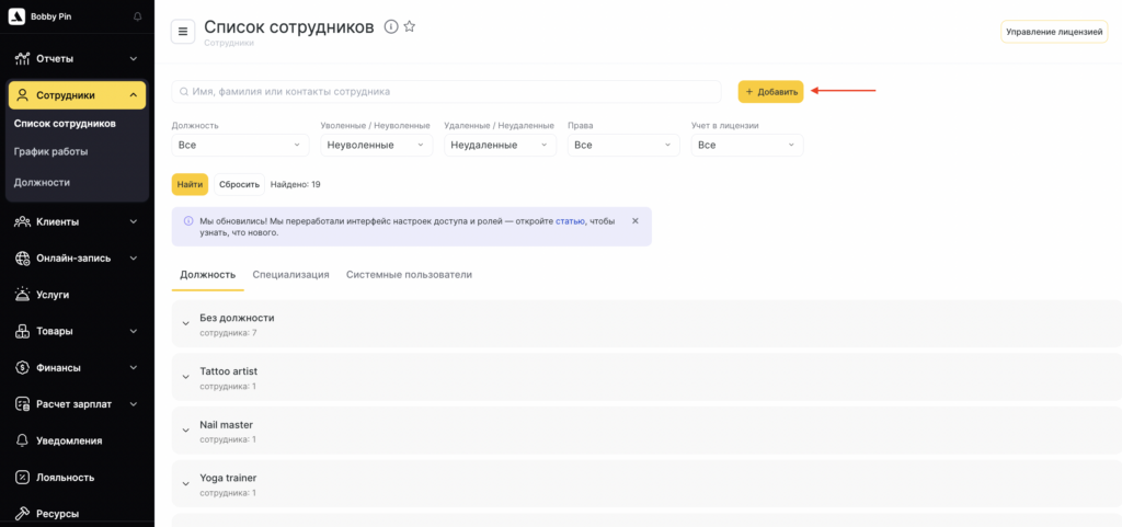 Подробнее о добавлении новых сотрудников читайте в статье Добавление сотрудников.
