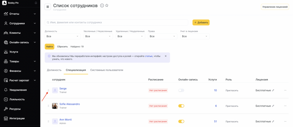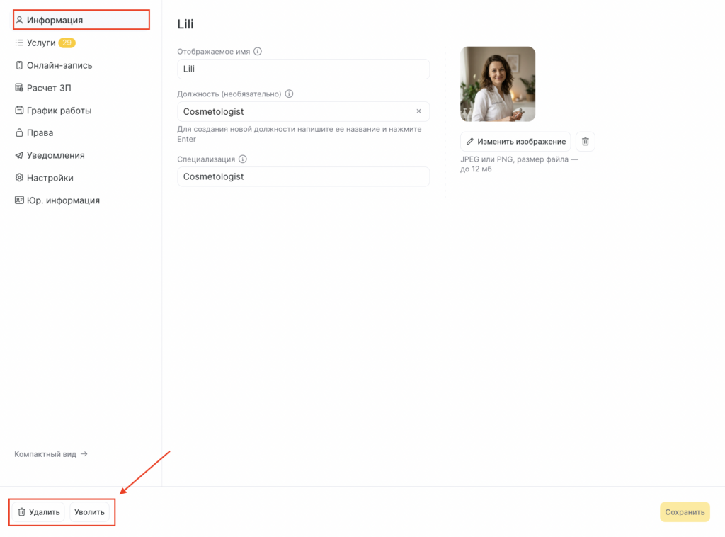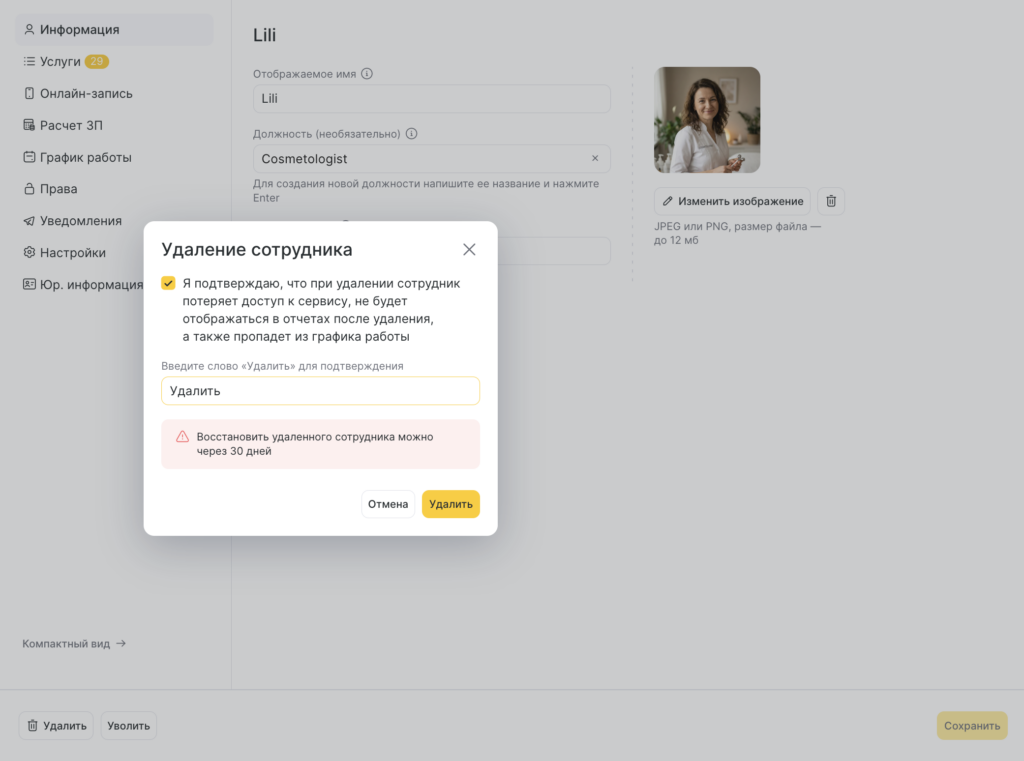 - При увольнении или удалении автоматически удаляется и доступ сотрудника в систему. Он больше не сможет зайти в Altegio.