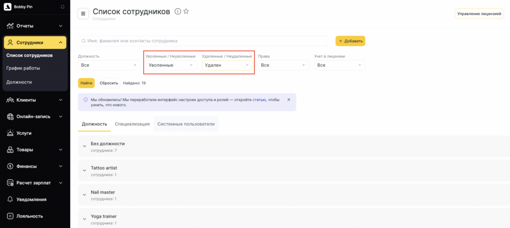 Для удобства вы можете просмотреть сотрудников выборочно. Для этого отфильтруйте список по Должности, Доступу, учету в лицензии или статусам Удаленные/Неудаленные, Уволенные/Неуволенные.
