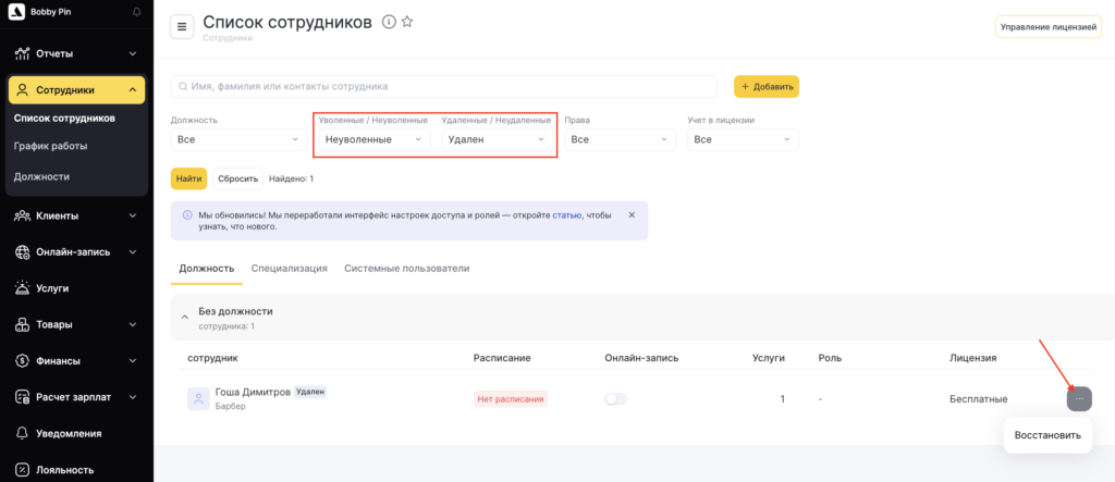 - Уволенного или удаленного сотрудника можно восстановить в течение 24 часов, по истечению 24 часов сотрудника можно восстановить только через 30 дней после увольнения.