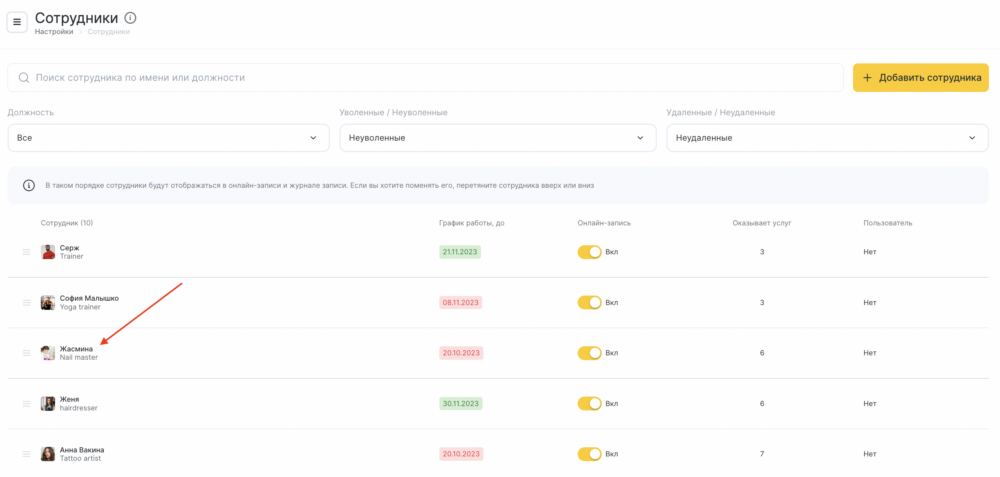 - Выберите сотрудника, нажмите на его имя .
