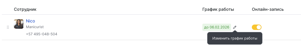- Выберите сотрудника, нажмите на его имя или на кнопку Изменить график работы.