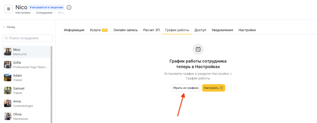 Также здесь можно удалить расписание сотрудника, нажав на кнопку Убрать из графика. После подтверждения действия сотрудник перестанет учитываться в лицензии. Текущий набор настроек будет удален. Сотруднику будет нельзя настраивать график работы, он также исчезнет из журнала записей и онлайн-записи.