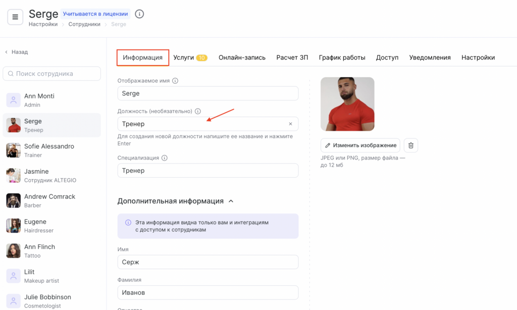 После редактирования разделов Услуги и Сотрудники настройте должности сотрудников.