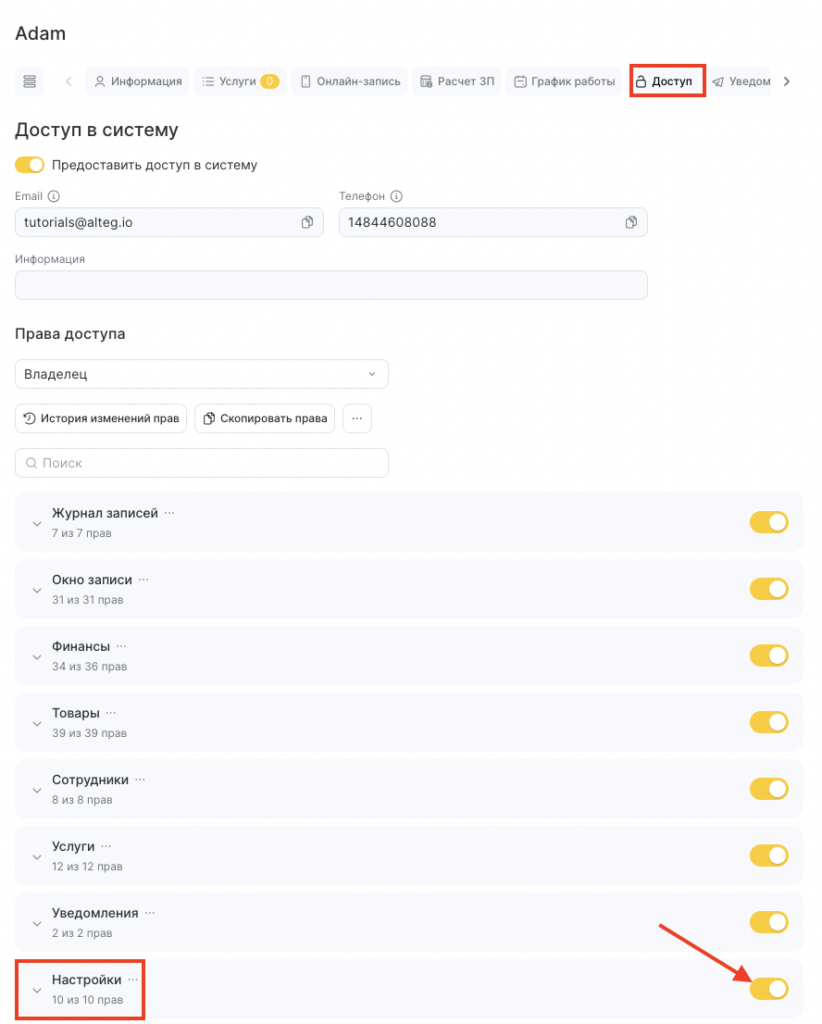 В этом разделе можно разрешить или запретить управление доступом сотрудников. Эта настройка предполагает, что сотрудник может управлять правами доступа других сотрудников по своему усмотрению и без согласования с руководством. Во избежание таких ситуаций доступ к этой функции должен быть только у сотрудников с расширенными полномочиями.