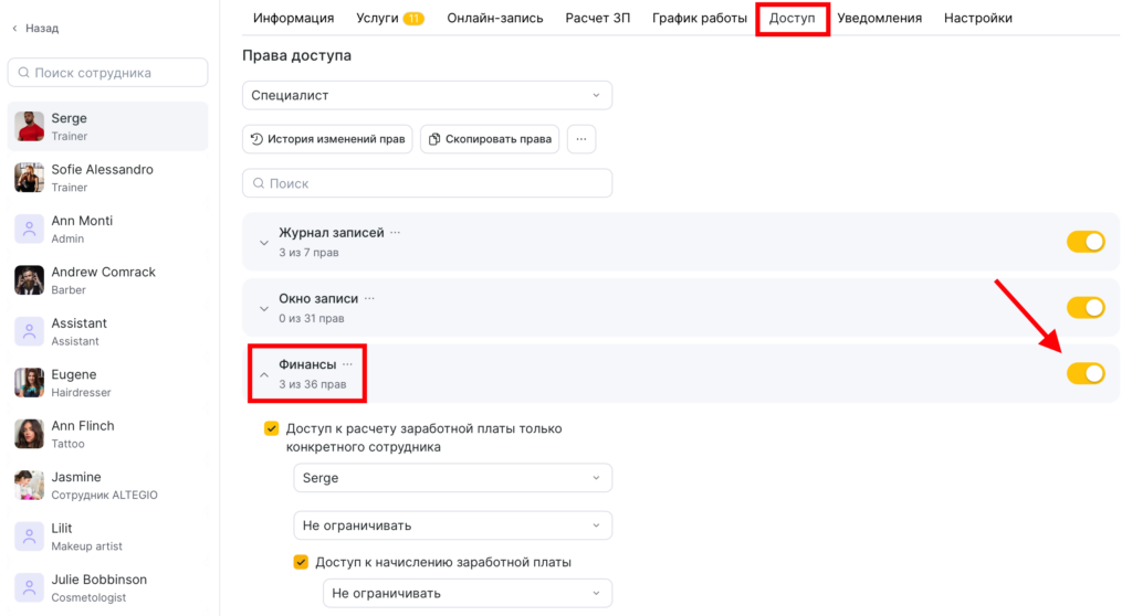 - Перейдите в Настройки > Сотрудники, выберите нужного сотрудника и откройте вкладку Доступ.