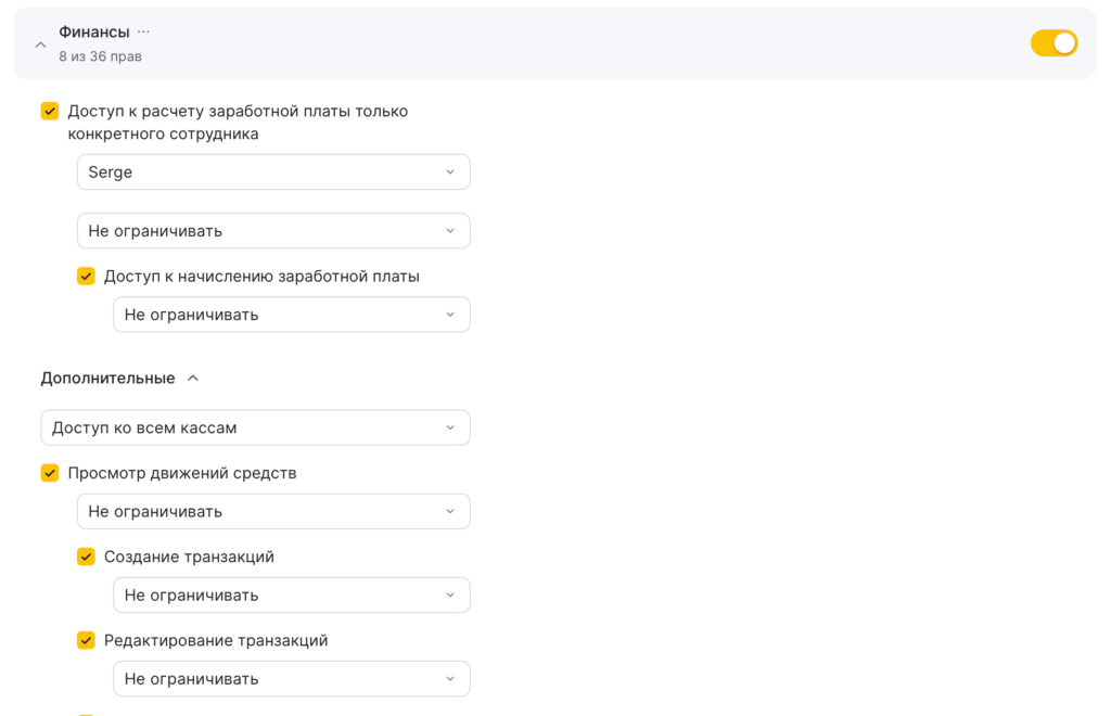 Выберите, к каким кассам сотрудник должен иметь доступ — ко всем или только к определённым. Это право работает только в связке с другими финансовыми правами.