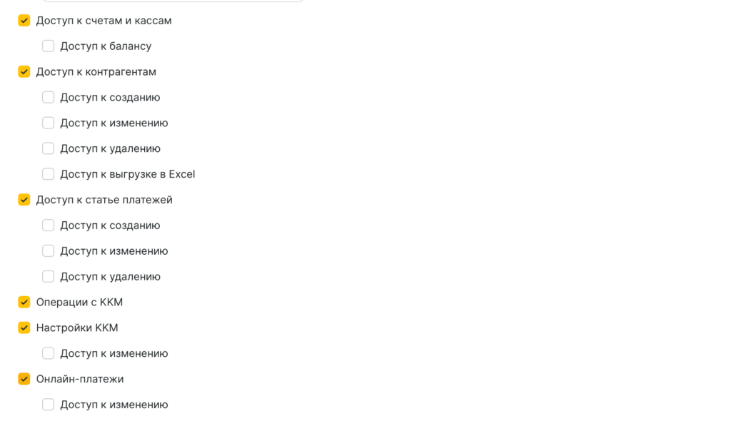 Доступ к изменению — разрешает сотруднику менять параметры ККМ и настраивать интеграцию с онлайн-кассой.