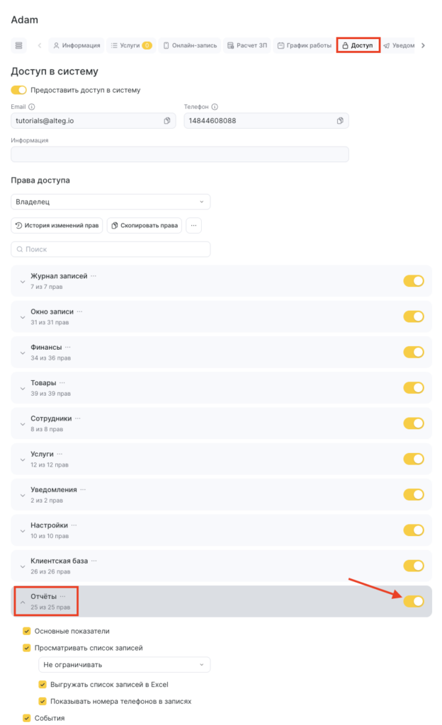 Включите опцию, чтобы сотрудник видел номера телефонов клиентов в разделе Отчеты > Записи.