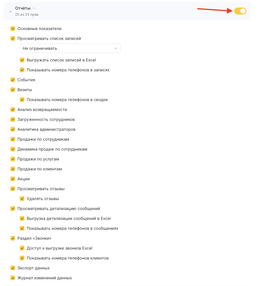 Включите опцию, если сотруднику нужно видеть номера телефонов клиентов в разделе Отчеты > Записи. - Просматривать список записей