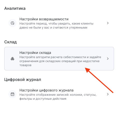 - Перейдите в раздел Товары > Настройки > Склад > Настрйоки склада.