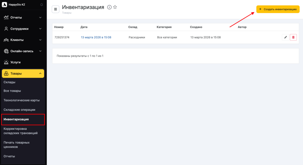- Перейдите в раздел Товары > Инвентаризация (режим Администрирование) и нажмите кнопку Создать инвентаризацию.