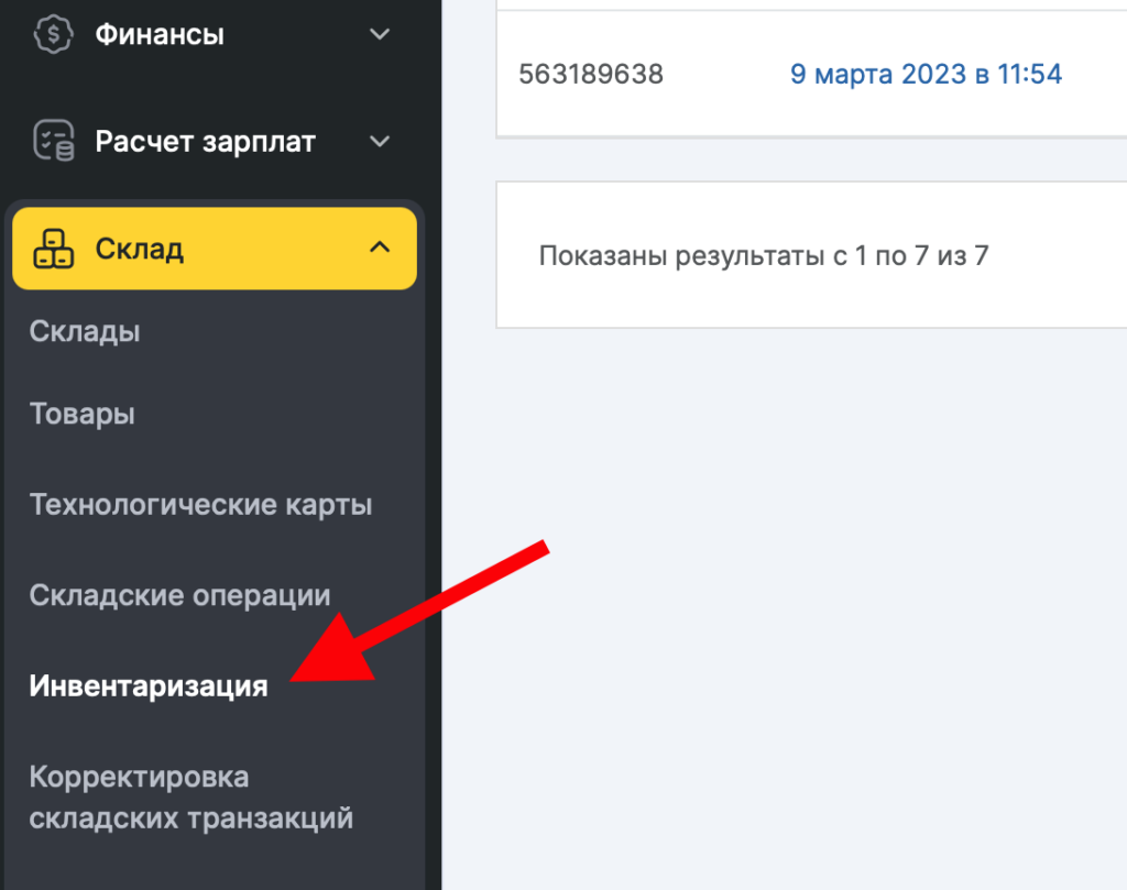 Операции, выполненные в процессе инвентаризации, можно найти Склад > Складские операции. При клике на дату такой операции, откроется документ с этой инвентаризацией.