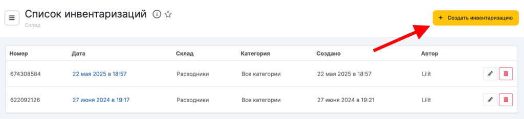 Все инвентаризации сохраняются, их можно отредактировать. Если вы удалите инвентаризацию, все складские операции, с ней связанные, будут удалены.