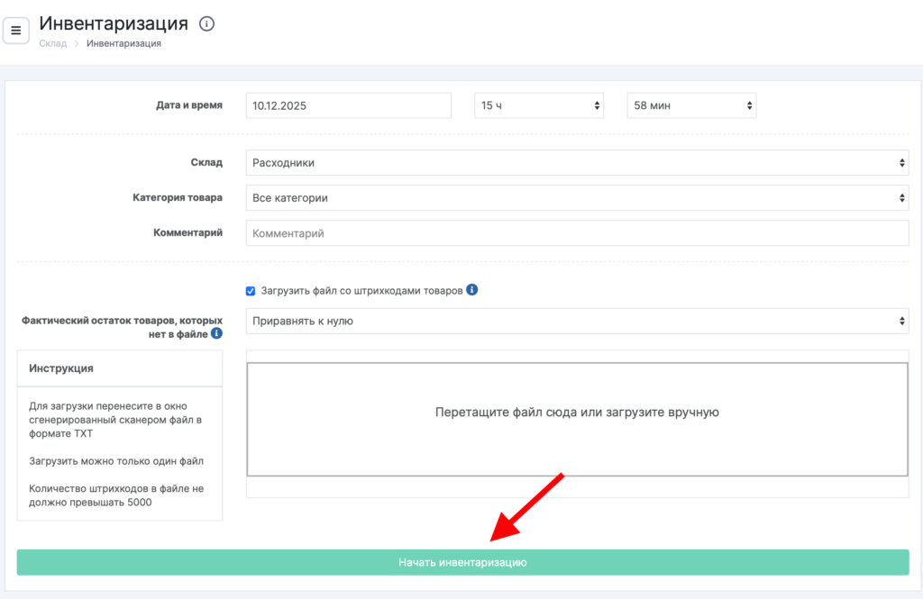 - При необходимости загрузите файл со штрих-кодами товаров. Файл в формате txt генерируется специальным сканером штрих-кодов товаров на складе.
