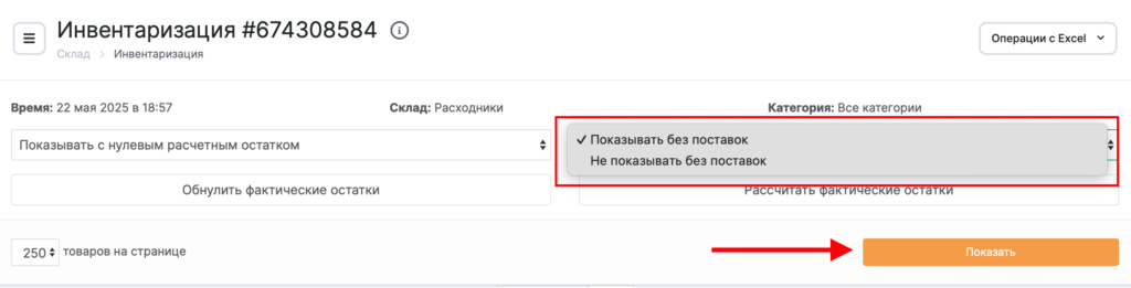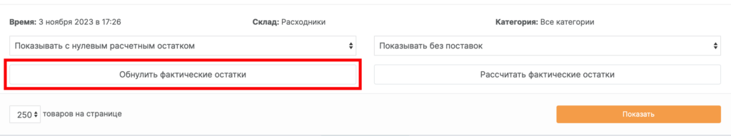 Если вам нужно обнулить все остатки по товарам, нажмите кнопку Обнулить фактические остатки, после подтверждения во всех товарах фактический остаток будет равен 0.