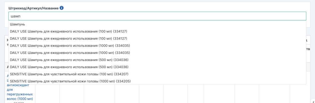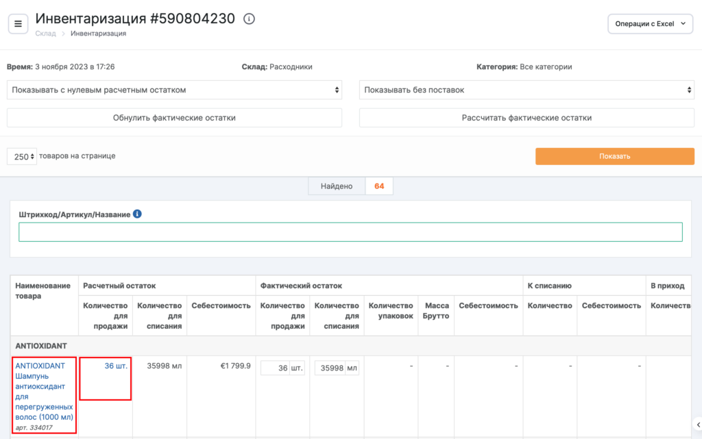 В инвентаризации можно найти товар в строке поиска для быстрого изменения. Если выбрать товар из списка в поиске и нажать на Enter, фактический остаток этого товара увеличится на 1. Не нажимайте на Enter без необходимости. Для поиска по таблице можно воспользоваться сочетанием клавиш Ctrl + F.