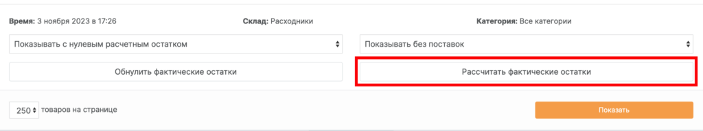 Если необходимо установить фактические остатки, равные расчетным (т.е. согласно складским операциям), нажмите кнопку Рассчитать фактические остатки.