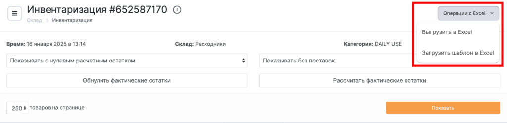 Инвентаризацию можно выгрузить в Excel через кнопку в правом верхнем углу Операции с Excel > Выгрузить в Excel.