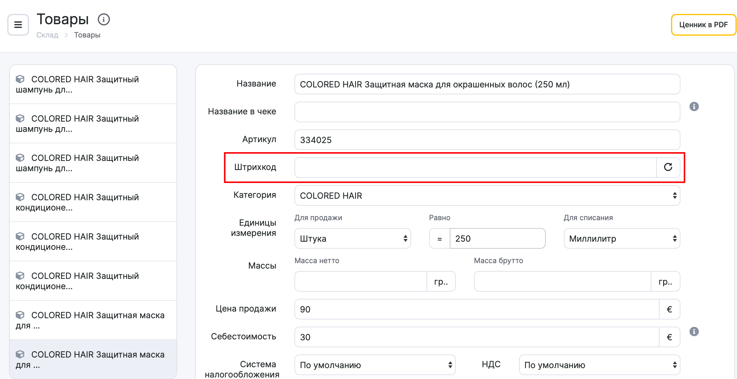 - Номер штрихкода появится в поле с товаром.