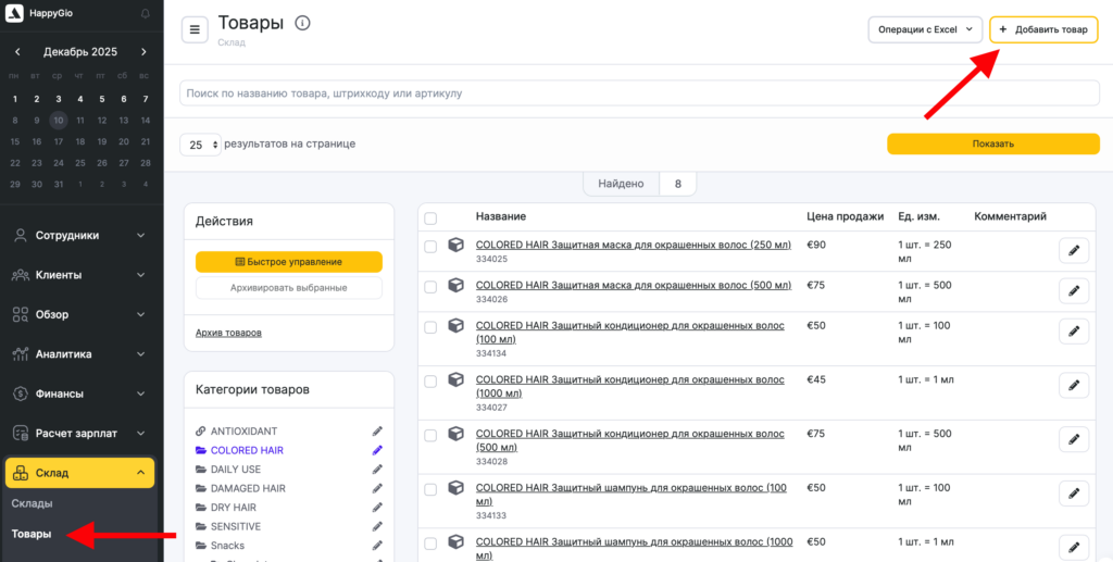 После создания и настройки категорий добавьте товары на склады. Товары можно добавлять по отдельности или списком через Excel (подробнее о том, как добавить товары через Excel читайте здесь).