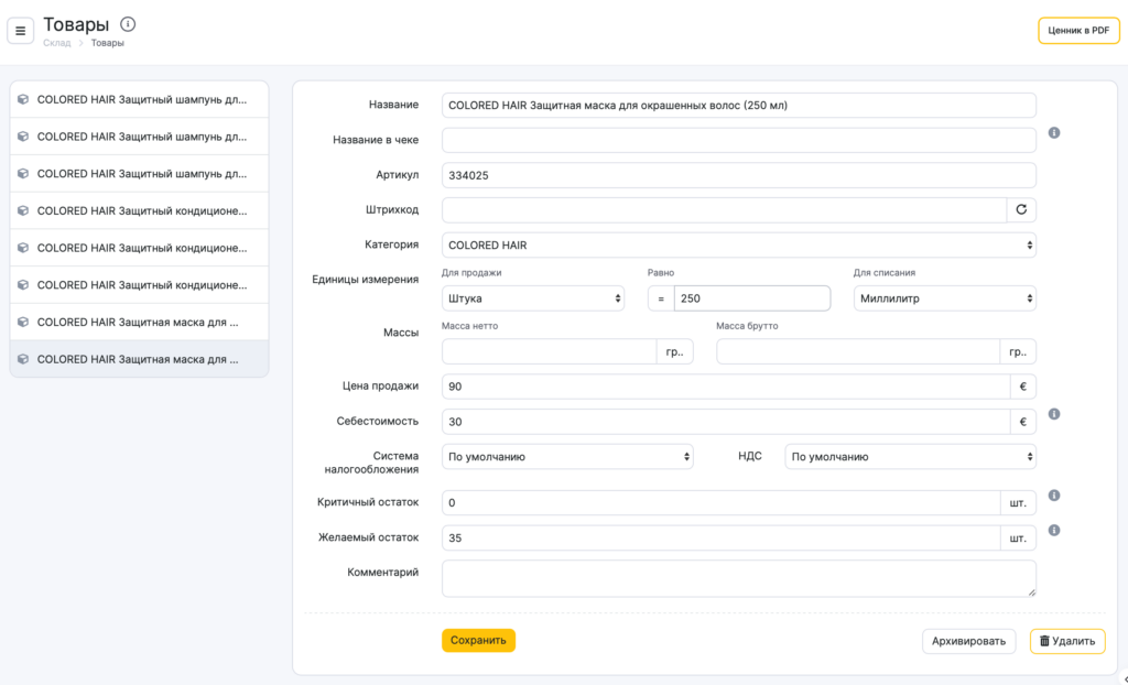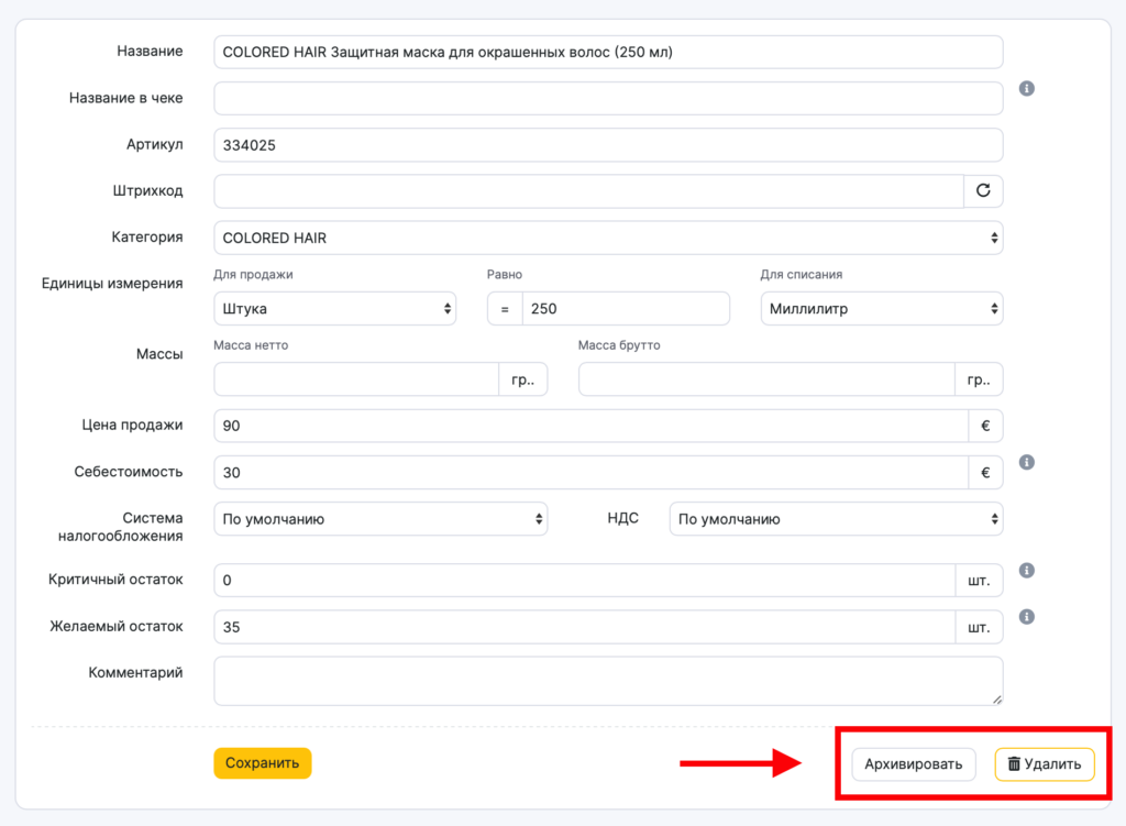 Также здесь вы можете удалить или архивировать товар. Архивация дает возможность не просто безвозвратно удалить товар, а заархивировать неиспользуемую номенклатуру, а после выбрать – удалить безвозвратно или восстановить ее в случае необходимости.