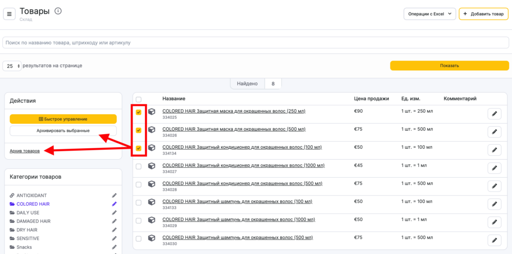 Чтобы архивировать сразу несколько товаров, перейдите в раздел Склад > Товары и выберите категорию, из которой хотите перенести товары в архив. В списке товаров отметьте галочками товары для архивации и нажмите на кнопку Архивировать выбранные.