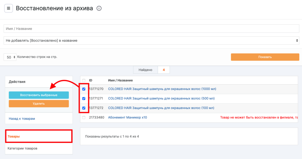 Удаленные архивные категории и товары восстанавливаются в архив (для этого обратитесь в службу технической поддержки Altegio).