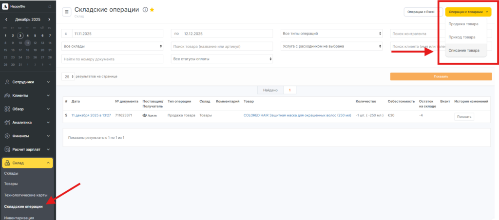 Все данные об этой операции вы можете просмотреть в разделе Склад > Складские операции.