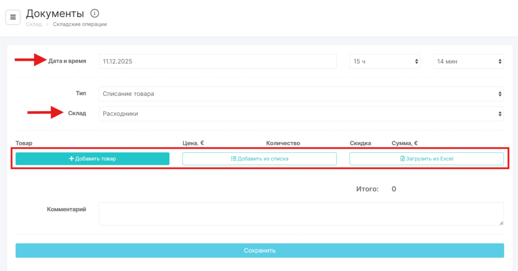 - Выберите Склад (склад обязательно должен быть с типом Для списания товаров).