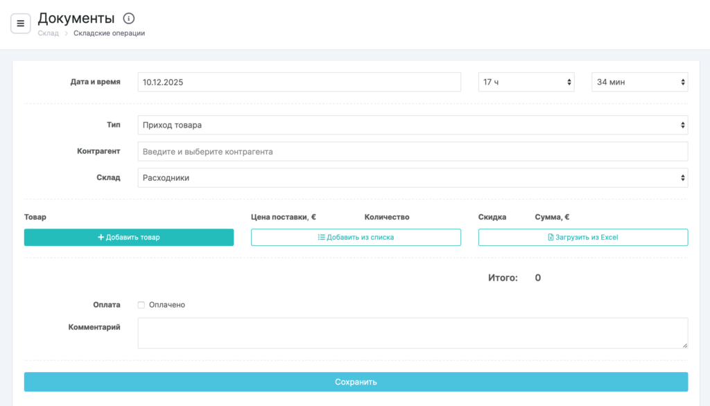 - В открывшемся новом окне укажите Дату и время создания складской операции. Введите и выберите Контрагента (поставщика товара, контрагента необходимо создать заранее, подробная инструкция здесь) и Склад, на который поступят товары.