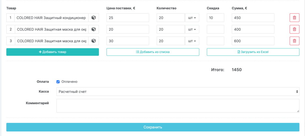 - Итоговая сумма (Итого) по каждому товару и по всей поставке выведется с учетом количества товара и указанной скидки.