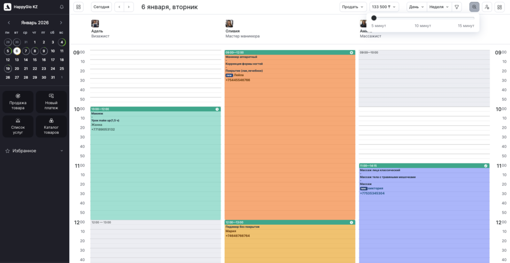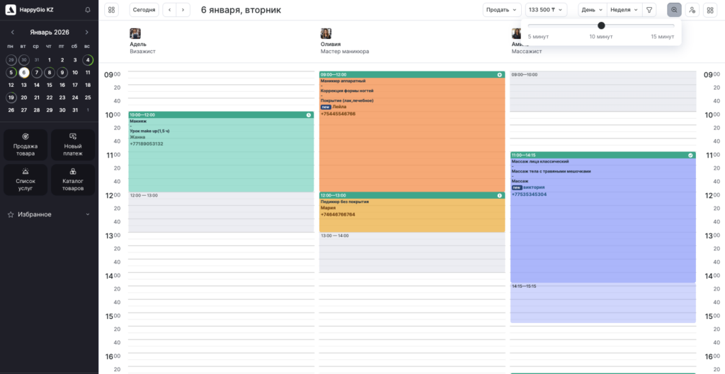 На минимальную длительность записи выбранное отображение не влияет — вы всегда сможете создавать записи, услуги и события длительностью от 5 минут.